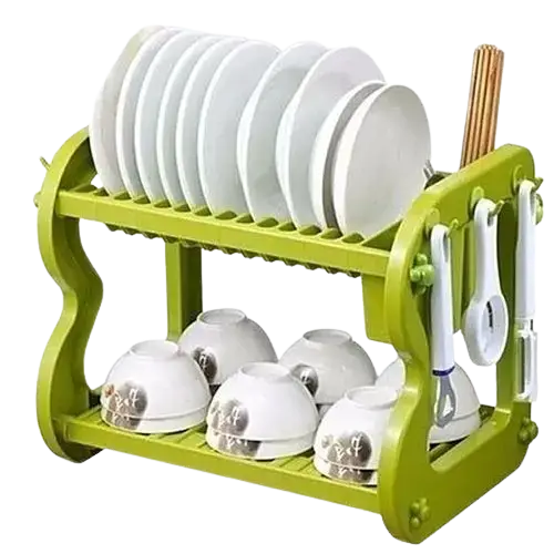 Keep your kitchen tidy and organized with this practical 2-tier dish drying rack. Designed to maximize counter space, it features a sturdy upper rack for plates and a lower shelf for bowls, cups and glasses. Side hooks provide convenient storage for cutlery and utensils, while the open design allows fast air-drying. Made from durable, easy-to-clean plastic, this dish drainer is lightweight yet stable, making it ideal for everyday use in small and medium kitchens. Its modern design fits seamlessly into any kitchen decor.